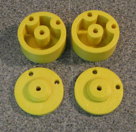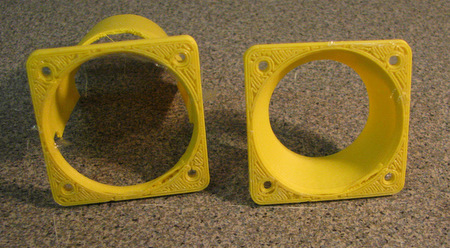 | The Fan shrouds above and Left may have been printed at .25 layer height which would account for the better appearance of the outer surface but the bottom edge certainly has more voids than I would expect. There's also apparently an adhesion problem (or a Gcode/slicing error - since it's identical on both) at the bottom right corner where the two layers of the inner ring of the shroud are. More later. | |