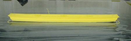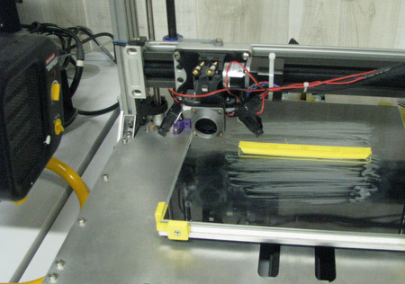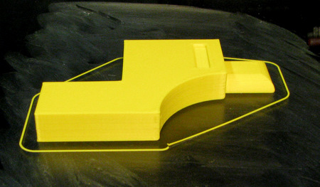 | This was my first attempt after making all of those changes. One other thing happened: the nut holding one of the bolts at the bottom of the J-head fan shroud fell off while this print was starting up. Fortunately is caused no damage as I was able to snatch it off the print bed before it got caught by the extruder. The first attempt peeled off of the glue coating easily. I noticed that the skirt loop was really spread out. This told me that my Z=0 setting was too low. But I had checked it! So I went looking for something that would make it change. I found that the Z-axis endstop was loose! I tightened it up and reset my Z=0 setting. |