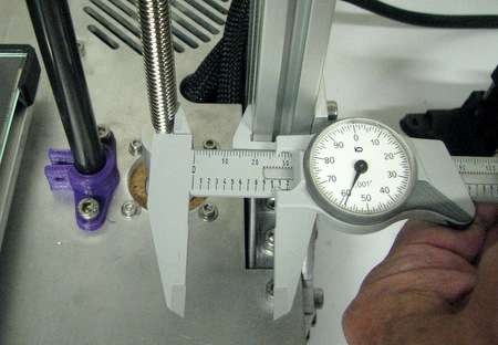 Unless you put in bed leveling screws of your own design there are no "adjustments" to level the bed. If you look closely, you'll notice that I have not yet attached my Kapton heater to the heat spreader. (You can see it drooping down in the center in the picture at left.) It's the reason my bed isn't level in the Y-axis. I'll postpone any Y-axis bed leveling (by shimming the corners) until after I attach the Kapton Heater. |