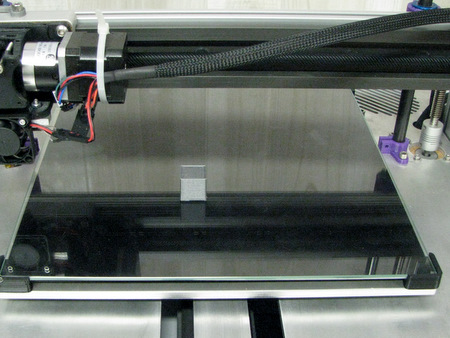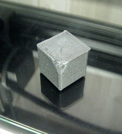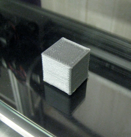 | The results were far from perfect. I had a first layer adhesion problem with what was the rear corner of the cube. My 20mm (.787 in) cube measures .778/.780/.778. The 3mm (.118 in) PLA filament I used measures .108/.114/.115 (end/middle/end) for a .112 average. So it's not surprising that the cube is undersized! However, considering the un-optimized state of affairs for this attempt, I consider this "First Print" to be a SUCCESS!! |