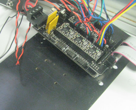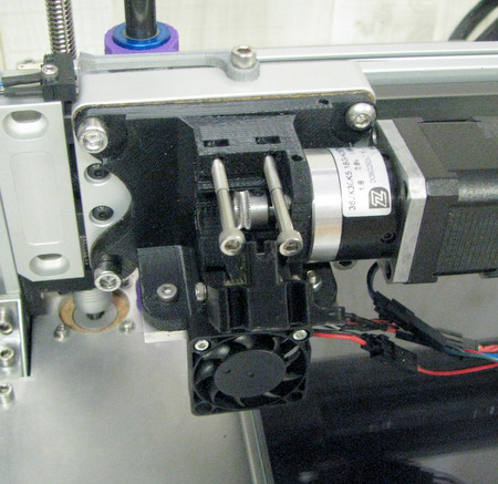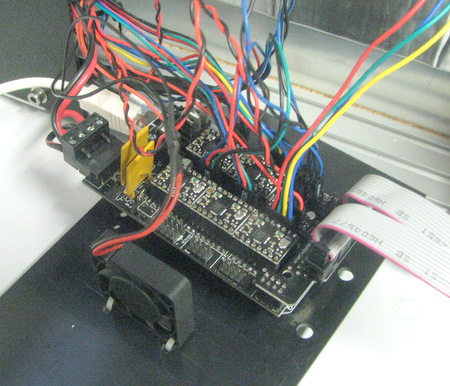 At this point, to proceed further with the assembly I need to be able to turn the printer on, see it report it's status, and give it commands from a PC to move the various axis and turn on the extruder and bed heaters.Fan mounted using small ty-wraps. |