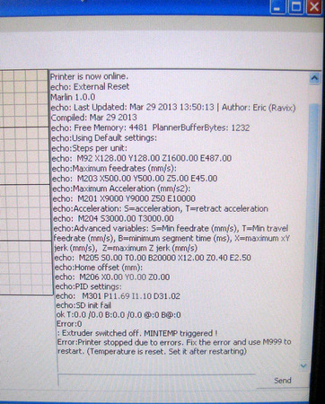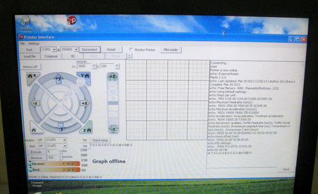 Pronterface connects to the RAMPS @250000 baud and reports everything OK. At this point, the RAMPS is being powered from the USB cable. |